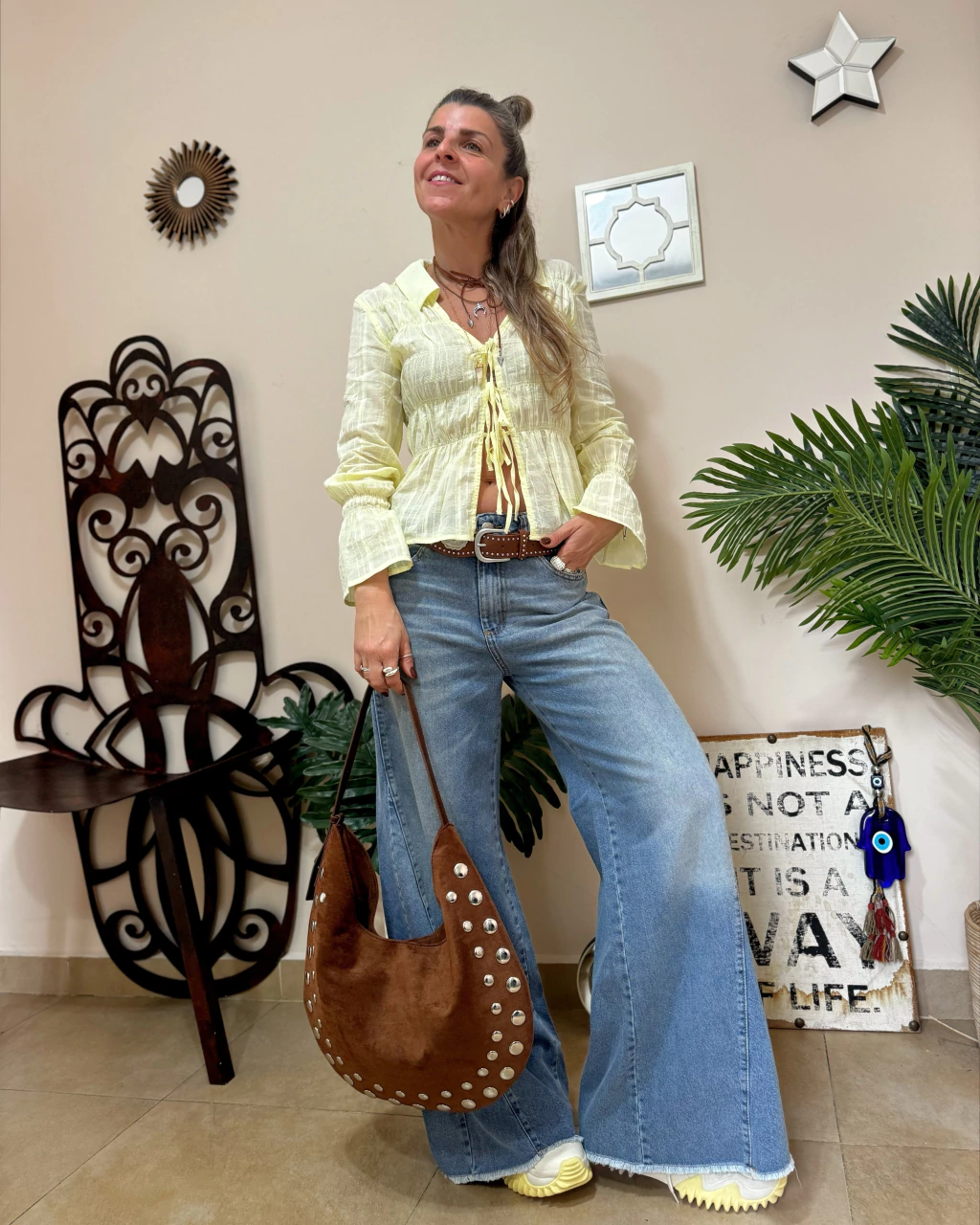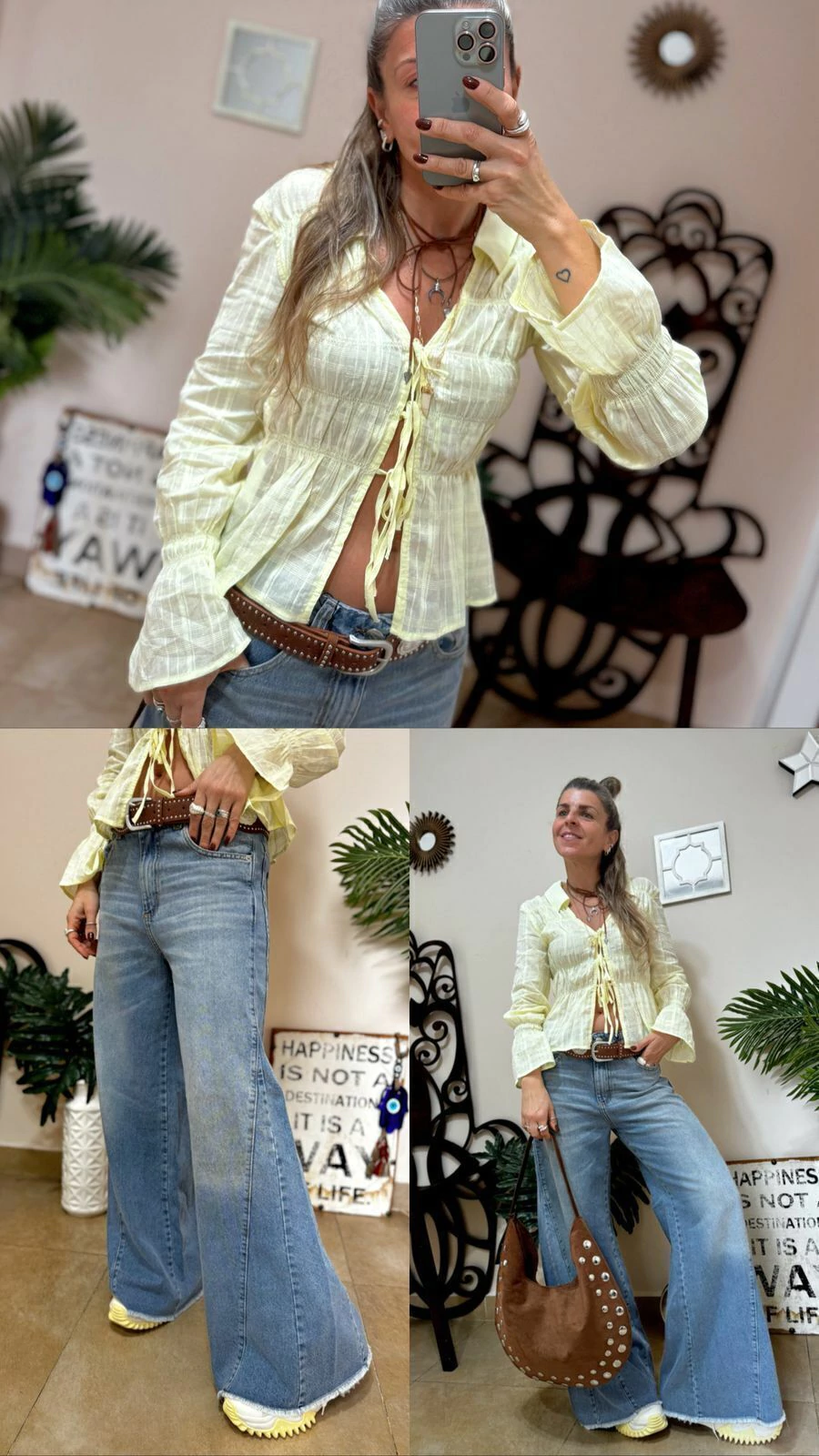 Blusa con cuello tipo camisero, manga larga, elastico en el frente y en la espalda, solo en color amarillo bebe. Disponible del talle S al L.