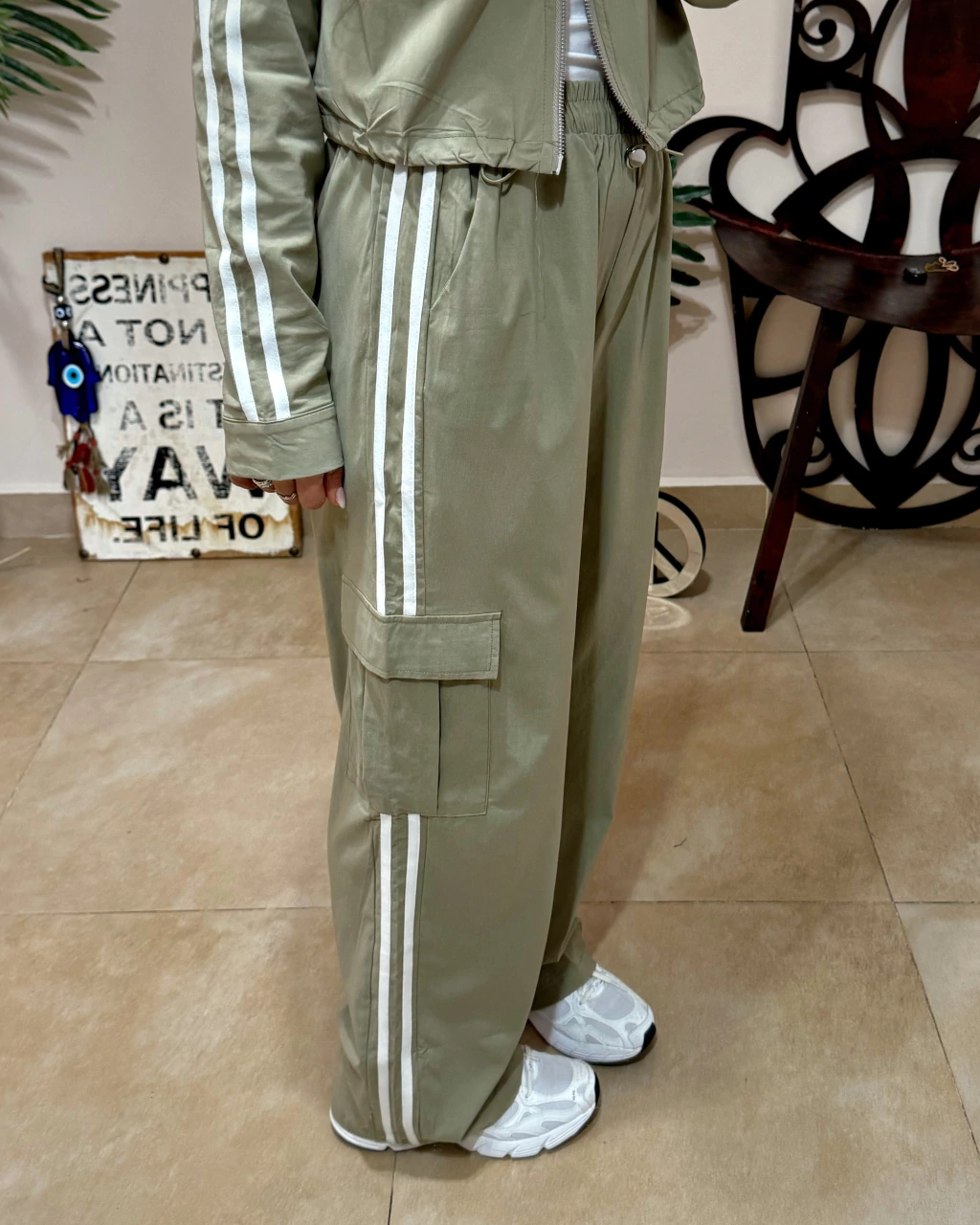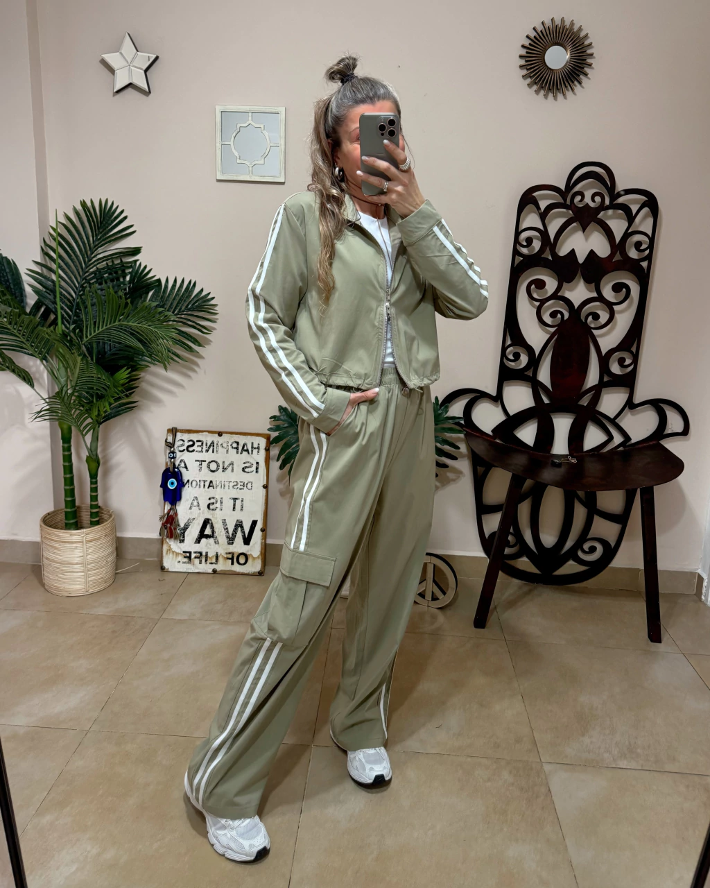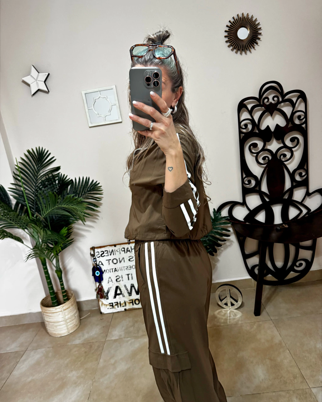 Conjunto de pantalon y campera, el patalon con elastico en la cintura y tiras en color blancas de costado y bolsillos. La campera con cierra de frente y elastico en la cintura para regular, tiras en color blanco en cada manga, viene en color verde claro y chocolate. Disponible en talle unico.