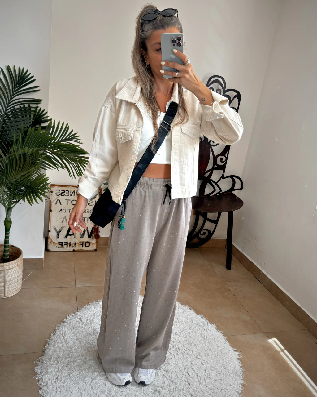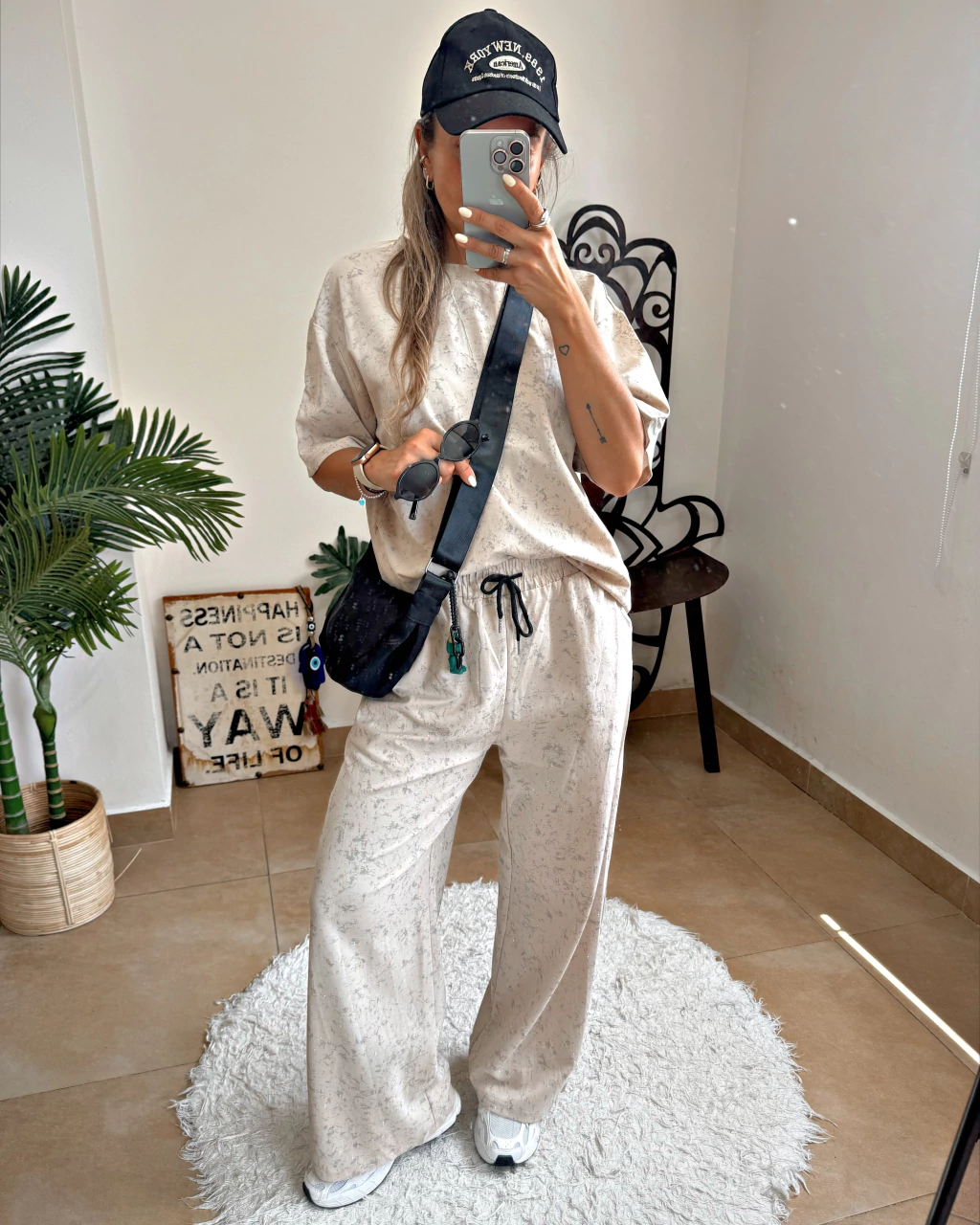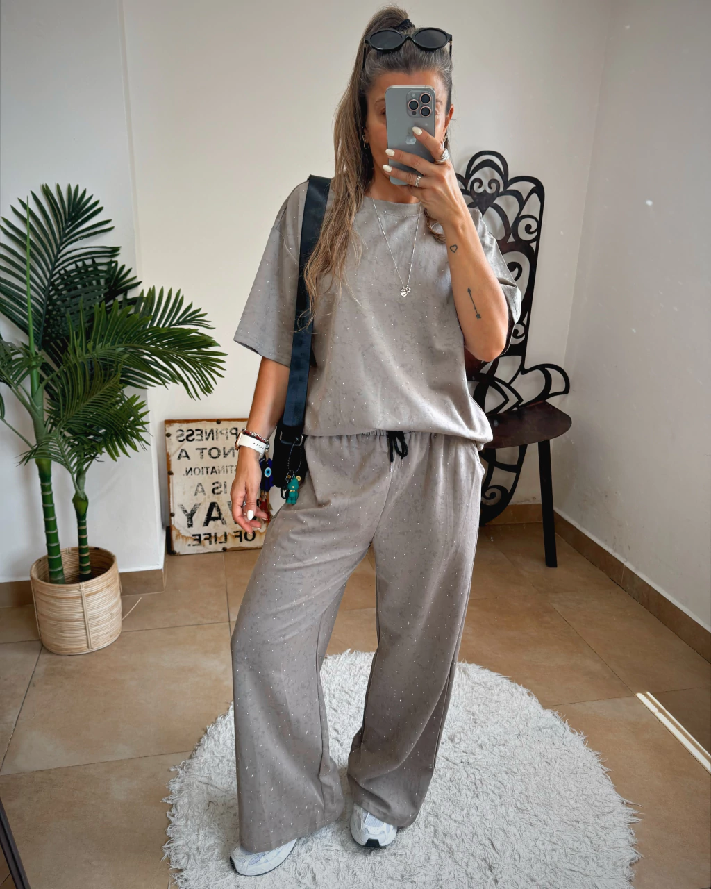 Conjunto importado de pantalon con remera, full estampado con detalle de brillitos, el pantalon tiene cintura con elastico y cordon para regularla y bolsillos de cada lado, viene en color gris y beige. Disponible en talle unico.