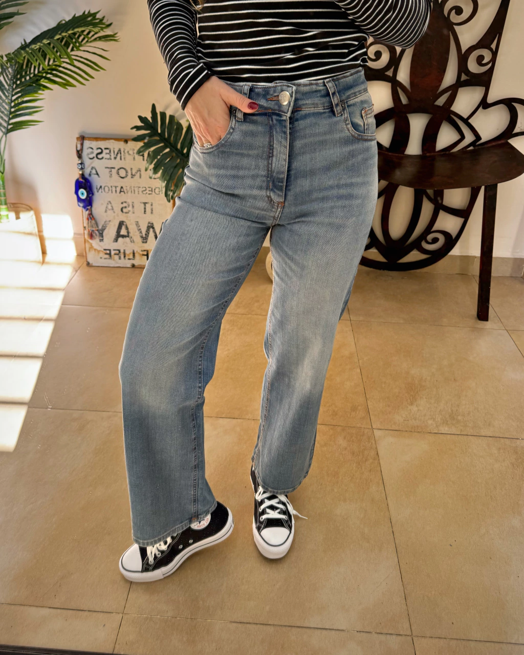 Jean tiro alto, corte wide leg crop, elastizado. Disponible del talle 24 al 34.