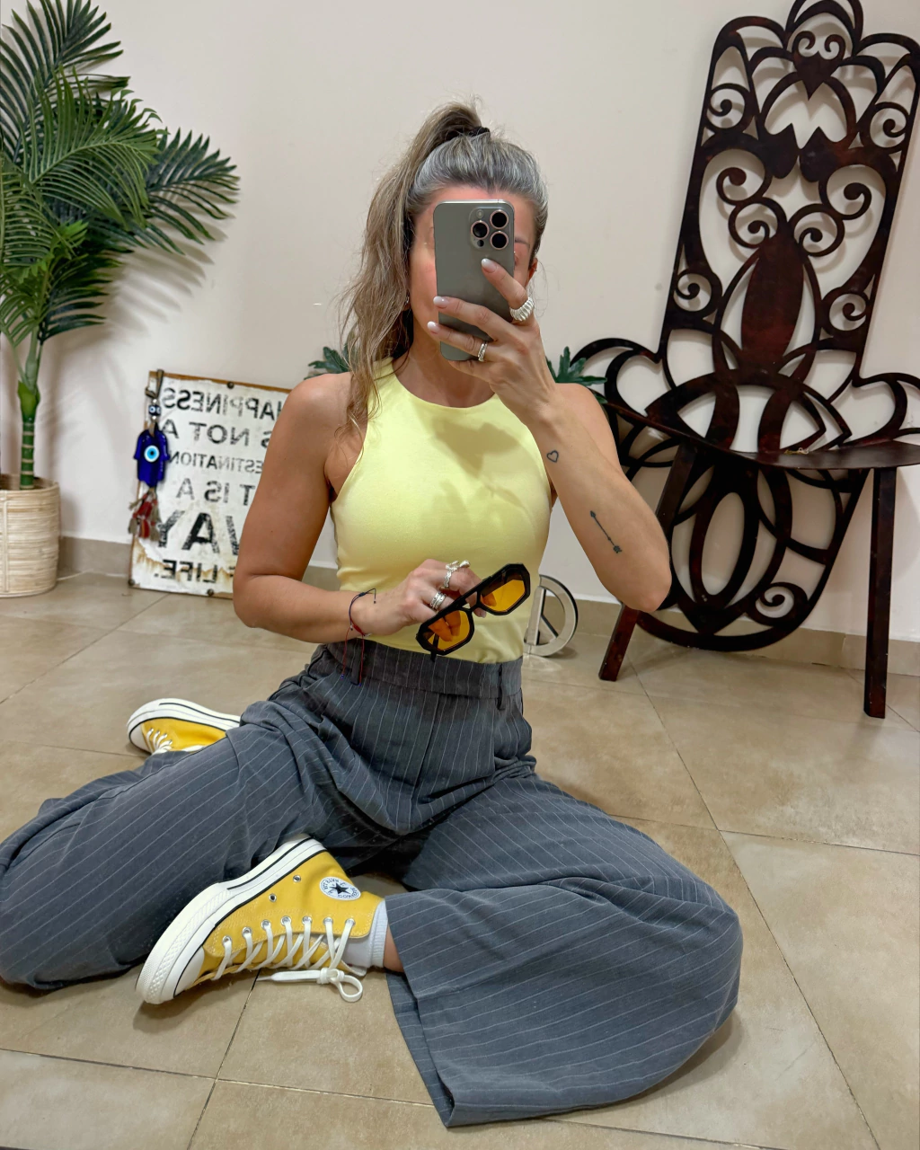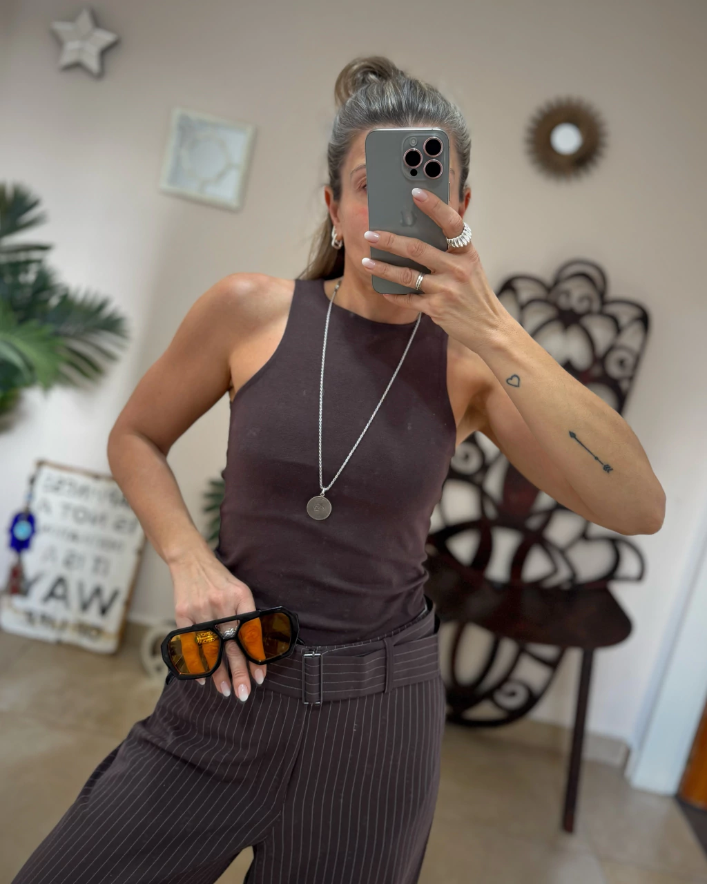 Musculosa de algodon con lycra y doble tela en la parte delantera, viene en color chocolate, amarillo y blanco. Disponible del talle S al L.