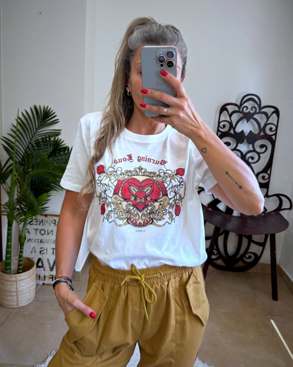 Remera cuello redondo solo en color natural con estampa en el frente en los tono rojos con glitter a tono. Disponible del talle S al L.